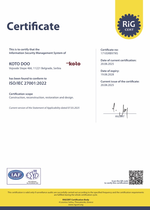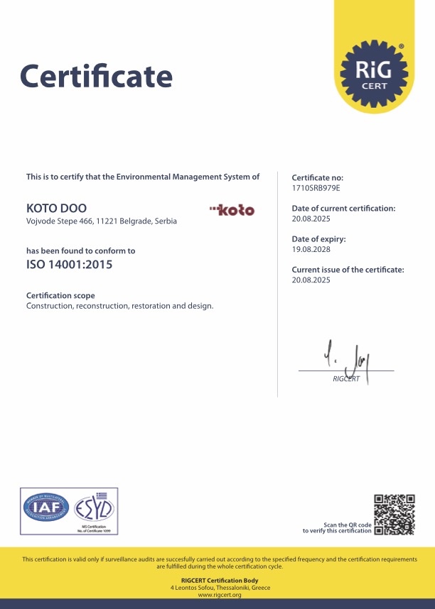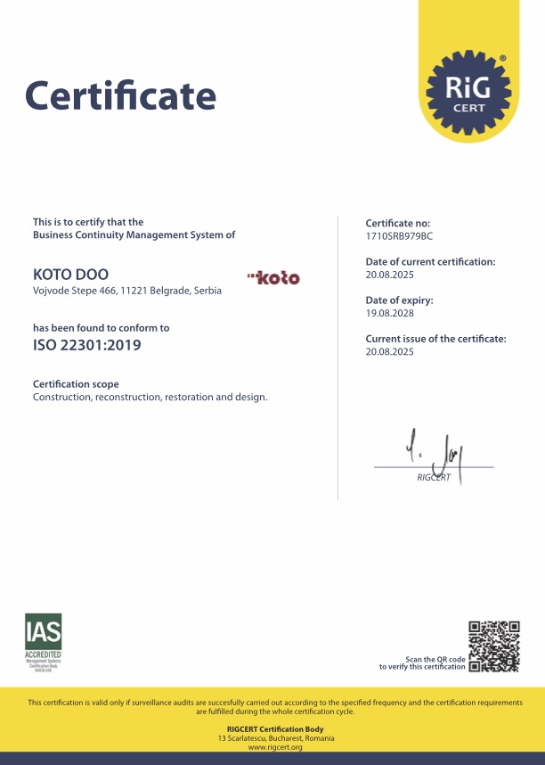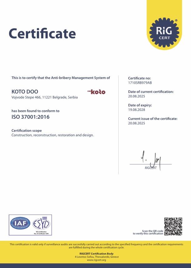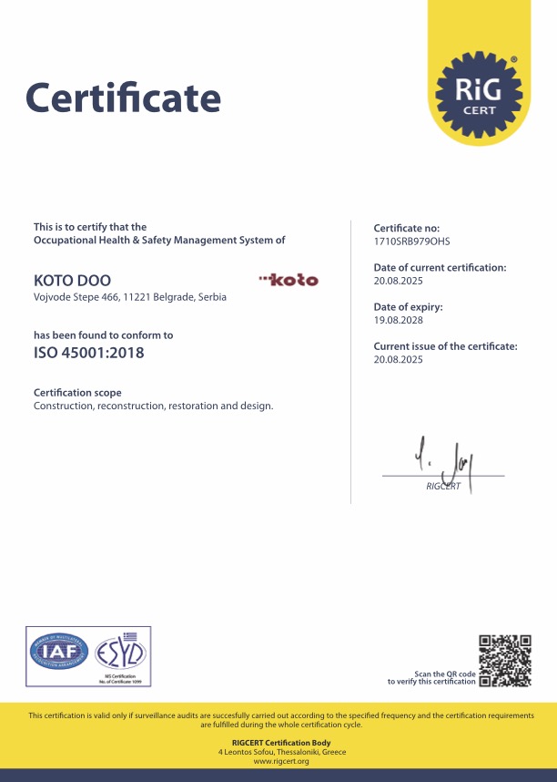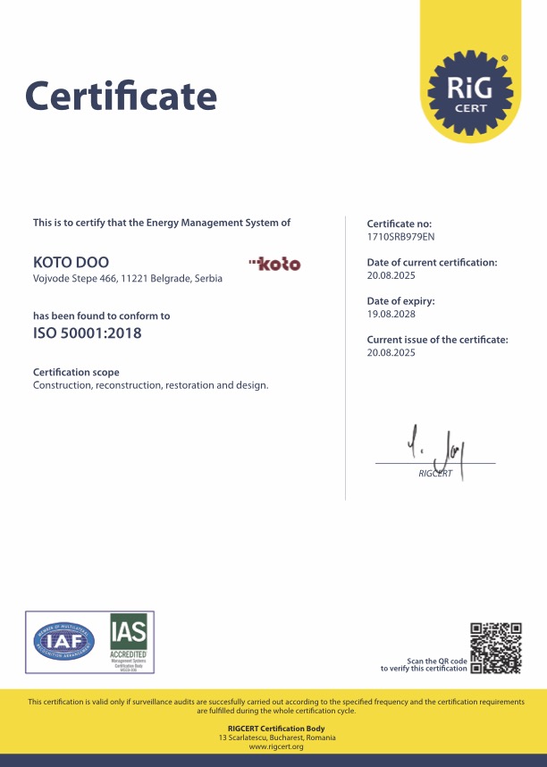 37001) safety and health at work (ISO 45001), energy efficiency (ISO 50001), the company KOTO